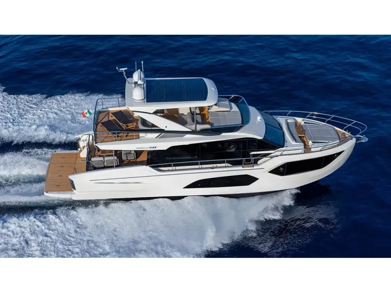 EVOLUTION THROUGH OUR EYES Born to reveal new and endless possibilities, the 60 FLY - The Absolute Prisma is a revolutionary model, uniquely built with a very high level of innovation for a yacht of this size. Thanks to new glazed parapets balustrades, the external lines are enriched by elegant, transparent barriers which offer breathtaking views both from the flybridge and the aft cockpit. In a new progression of our cockpit design, it does not include fixed elements or furniture, and can be furnished according to the owner's needs. Moreover, thanks to two convenient side stairwells, the large swim platform is easily accessed for you to enjoy right at the water's edge. Adjacent to the platform, a fixed corridor offers direct access to the crew cabin. The galley, dining, and relaxation zones, as well as the highly technological helm station, offer extreme livability, elegant lines, beautiful color contrasts, and lovely finishes. The bow area is also designed for maximum versatility thanks to a sunbathing zone and a comfortable sofa with a table. This is the perfect spot to listen to music, socialize, and enjoy some privacy; all in one, day and night. State-of-the-art technology takes the form of modern and fully-equipped dashboards with easy-to-use equipment, always at hand. The helm stations on the main deck and flybridge have double seats and even a third mooring station can be installed astern. The 'green' approach of the shipyard is recognizable in the possibility of integrating solar panels in the hard top to achieve a lower environmental impact and excellent levels of autonomy, especially at anchor.