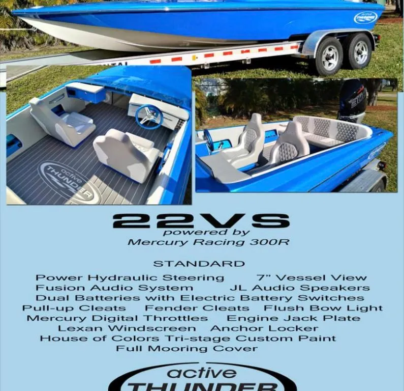 This Active Thunder Banshee 22' Sportboat is powered by Mercury 300 Hp outboards, is a new single outboard powered custom boat. The unique interior is made with only the best materials to ensure comfort when riding. it's a one of a kind look on a boat that offers a one of a kind experience.