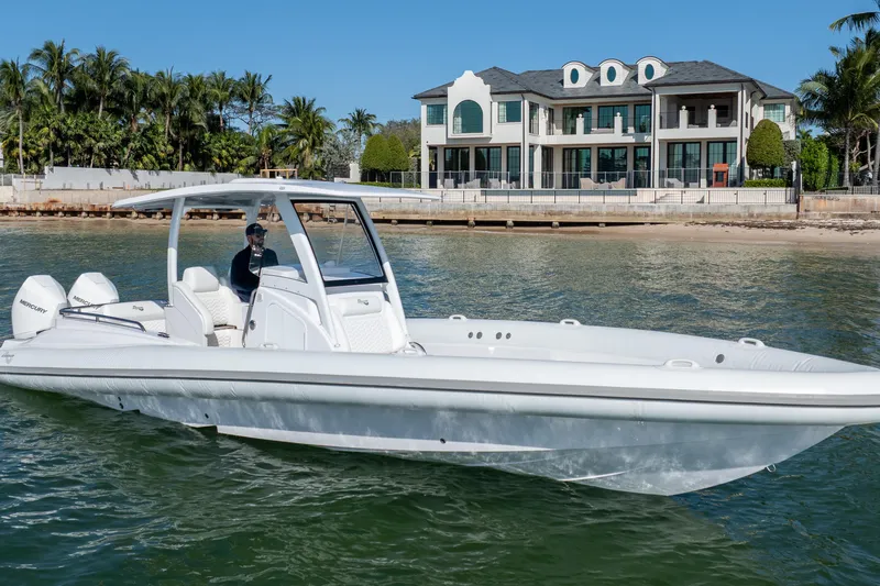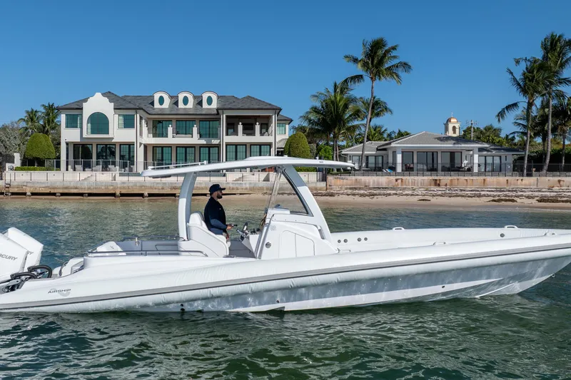 Introducing the remarkable 2025 Airship 340, a Rigid Sports Inflatable that seamlessly combines performance and style. With an impressive overall length of 34 feet, this vessel is designed for exhilarating adventures on the water. The hull, crafted from durable fiberglass, ensures both strength and stability, making it ideal for various marine conditions. Powered by twin Mercury Verado 300 outboard engines, each delivering 300 horsepower, the Airship 340 promises an exhilarating ride with a maximum hull speed of 65 knots. With only 36 hours of use, these engines are in excellent condition, ready to propel you into your next adventure. The boat is equipped with essential features, enhancing your experience on the water. Whether you're cruising or engaging in water sports, the Airship 340 offers a thrilling and reliable performance, making it a fantastic choice for boating enthusiasts. Embrace the open water with this exceptional vessel!