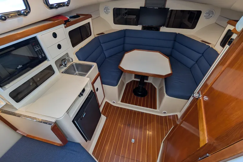 The Albin 30 FC (a limited-production extended variant of the popular single-engine 28 Tournament Express) was crafted by the Rhode Island-based manufacturer known for its high-quality Downeast vessels. This model comfortably accommodates a family of five, thanks to its unique aft stateroom, quarter berth, and convertible forward dinette.