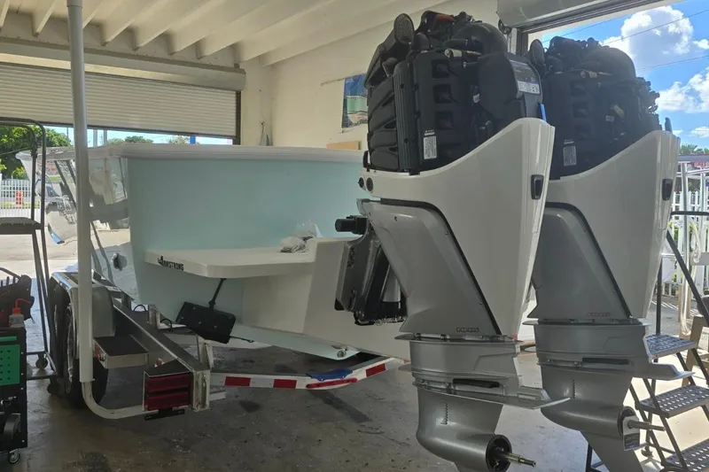 B Model with Full transom with Armstrong Bracket w/ladder, Spray rails, Ice Blue colored hull, Fishbox with diaphram pump, Livewell w/seacock, dual 800 gph pump, Saltwater washdown, Electric reel outlet, Two tone cockpit sole using Ice Blue Awlgrip w/Griptex non-skid, 40 gallon fresh water washdown, Jabsco Electric marine head and holding tank, Dual Shurflo 2000 GPH bilge pumps with Ultra Float switches, Zipwake Pro 300S, hydraulic/electronic steering, Triple AGM Group 31 batteries, ACR12 Volt dual USB & wireless phone charger, EZ2CY 3 sided enclosure, Ritchie SS-2002 Compass, NOCO automatic battery charger, Gemlux SS Rod holders, Lumitec under gunnel LED lighting, Forward seat backrests, Removable wrap around backrest, folding footrest and cushion on top of livewell, Hard top with E-box, rod holders, spreader & courtesy lights, Hard top underside color Ice Blue, Powdercoat all pipework, Dual Garmin 1643 and Garmin GT17M-THF (CHIRP 1000W Thru Hull), Garmin GXM-54 XM Sat. Weather/Radio, Garmin Reactor 40 Autopilot w/Smart Pump, Fusion Apollo MSRA-770 Stereo w/MHD600/4 Amp, 2-M6-880 & 2-M6-770 by JL Audio, Garmin 215 VHF radio with AIS in w/4' Digital antenna