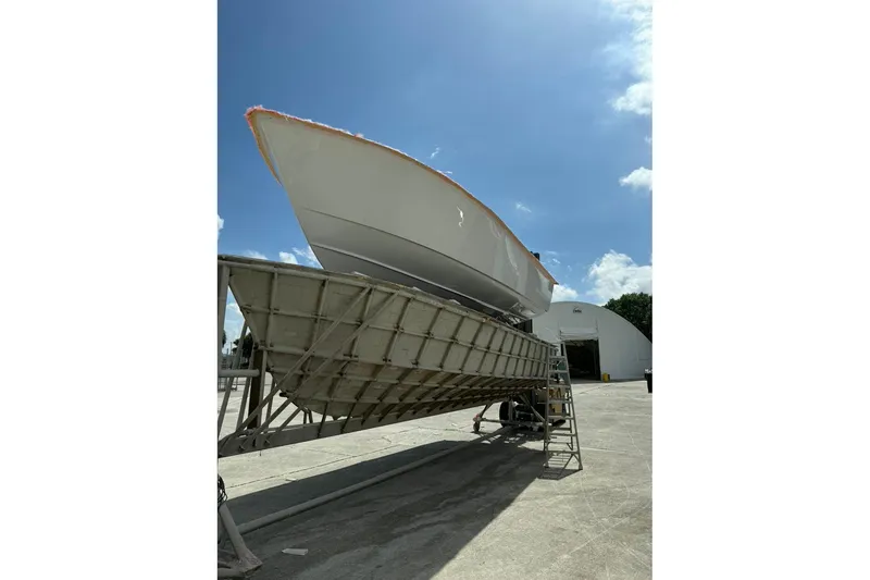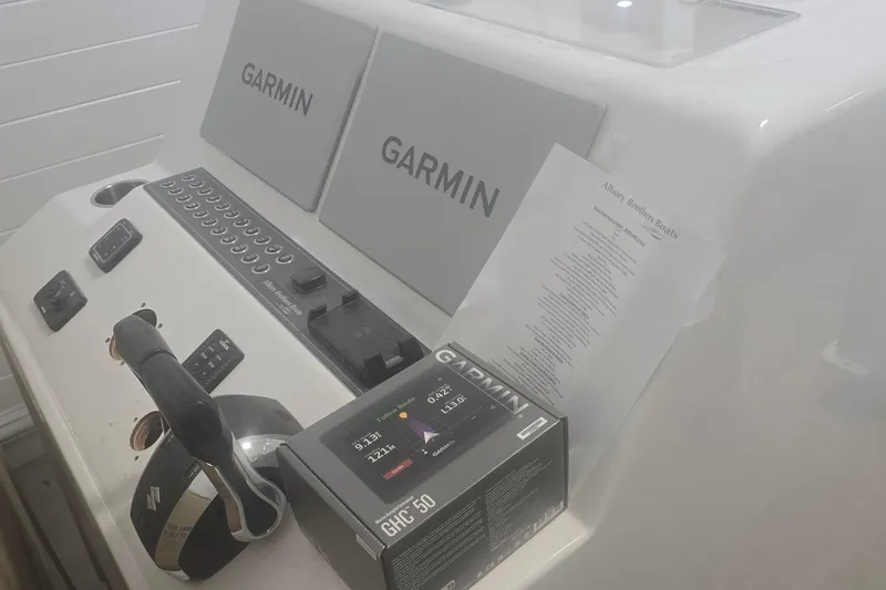 B Model with Full transom with Armstrong Bracket w/ladder, Spray rails, White hull, Awlgrip painted boot top - Navy Blue, Fishbox with diaphram pump, Livewell with seacock, dual 800 gph pump, and overboard discharge, Saltwater washdown, Electric reel outlet, Two tone cockpit sole using Matterhorn White Awlgrip paint with Griptex non-skid, 40 gallon fresh water washdown, Dual Shurflo 2000 GPH bilge pumps with Ultra Float switches, Lenco electric trim tabs, Uflex Silver Hydraulic steering w/twin cylinders, SS wheel & powerknob, Triple AGM Group 31 batteries, dual USB outlet and wireless phone charger, EZ2CY 3 sided enclosure, Ritchie SS-2002 Compass, automatic battery charger, Electric marine head and holding tank, Gemlux SS Rod holders, Lumitec under gunnel LED lighting, Forward seat backrests, Removable wrap around backrest, folding footrest and cushion on top of livewell, Sunbrella Horizon Quilted Upholstery Upgrade, Hard top with E-box, rod holders, spreader & courtesy lights, Hard top underside color Matterhorn White, Garmin 1643xsv & 1643 second display, Garmin CHIRP 1000W Thru Hull, Garmin Reactor 40 Autopilot w/Smart Pump, Garmin GHC-50 Autopilot, Fusion Apollo MSRA-770 Stereo w/MHD600/4 Amp, 2-M6-880 & 2-M6-770 by JL Audio, Garmin 215 VHF radio with AIS in w/4' Digital antenna