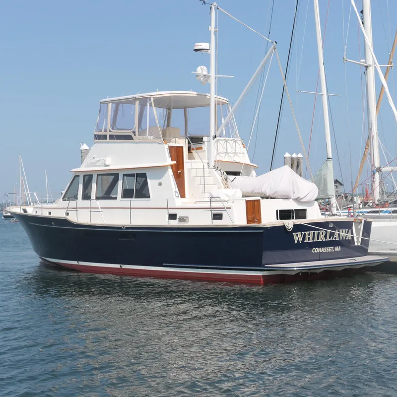 WHIRLAWAY is a classic three-stateroom flybridge motor yacht, designed by C. Raymond Hunt Associates. The interior finish is American cherry, crafted with New England craftsmanship. She is equipped with complete electronics at the upper and lower helm stations. The aft owner stateroom (queen), the forward cabin (V-berth), and the port cabin (pilot berths) provide berths for a crew of six. There are two heads, both with full shower stalls. The galley has an electric cooktop, a convection oven/microwave, and drawer refrigeration. The flybridge seats six comfortably in a settee, an L-shaped dinette, a helmsman seat, and a navigator seat. The main salon features a custom drop-leaf table for dining. The electrical power is provided by a 16 KW generator, solar panels mounted on the carbon fiber flybridge hardtop, and twin Victron Quattro 5000-watt inverters (a total of 10,000 watts). The Victron system manages the vessel’s power demands. The air-conditioning/heating system has three zones.