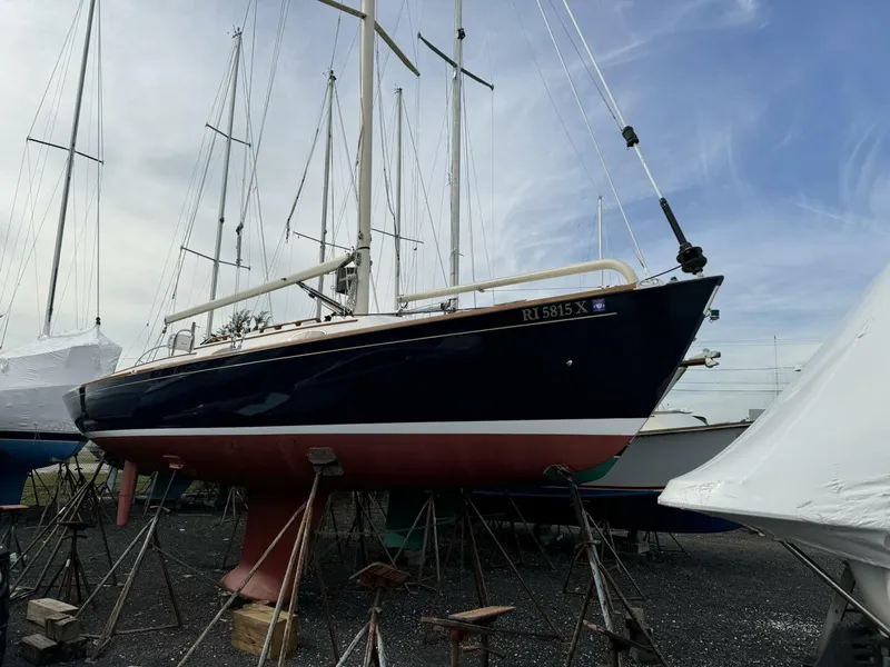 The Alerion Express 33 features a combination of modern underwater lines and a deck, cockpit, cabin and topside by the Pearson design Group has produced a yacht that lives up to the Herreshoff legacy of classic beauty. The amazing strength of a modern carbon fiber mast by Hall Spars safely allows the elimination of the backstay, which in turn frees the mainsail for significantly larger size and better aerodynamic shape-proven by record setting windsurfers, multihulls and America's Cup contenders. Sail control by electric winches enables one person to hoist, reef, trim and lower sail, all from the wheel station. With the patented Hoyt Jib Boom adding offwind power, this is a 2 sail, self tacking rig that projects more sail area than any ordinary rig with a 150% genoa. The payoff is excellent light wind and offwind speed-all easily single-handed. Sail tests indicate speed superior to the competition and all for more reasonable price.