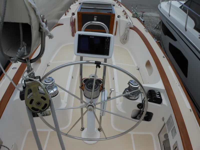 - Yanmar start panel with tachometer and alarm; inset starboard cockpit near helm