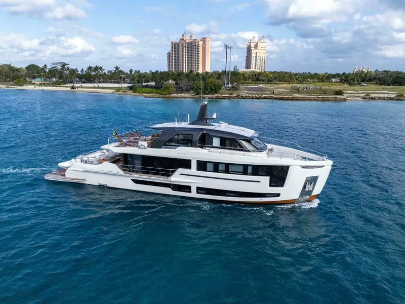 Luxurious 5-stateroom, 7-bath superyacht with impressive 7' ceilings and exceptional volume. Features a spacious cockpit with a plunge pool, outdoor dining, and seamless flow throughout. The flybridge offers wind protection forward and open space aft for outdoor comfort. Engineered for tranquility, this is the quietest yacht we've experienced.