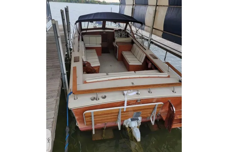 This 1990 26' Runabout has a unique floor plan with seating which brings the group forward to include the captain in the conversations unlike many other boat designs. Powered by a 5.7 liter Volvo Penta Duo-Prop you have plenty of power to run and great control for docking with the Duo-Prop's additional pull from the second propeller. Features include: Stereo, depth finder, compass, 12 volt accessory power source at the helm, trim tabs, remote spotlight, dual electric stainless steel trumpet horns, opening mahogany windshield, windshield wipers, dual fuel tanks (52 gallons total), full mahogany interior package, cockpit ice box, custom seating design (port side companion seat with reversible back rest and storage below, port and starboard inward facing benches with incorporated storage, full-width aft bench), abundant under seat storage spaces throughout the boat, in-floor storage locker, forward cuddy with v-berth and concealed porta-potty, overhead tinted deck hatch, convertible sun top, over the windshield cockpit cover with transom flap, mahogany aft rail, mahogany stern flag pole with flag, 3/4 width mahogany swim platform, folding mahogany 4 step swim ladder, and stainless steel aft lifting ring/water sports towing point.