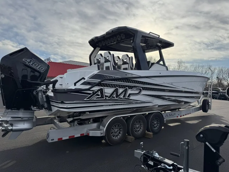 2026 AMP 333- 36 Hours- Twin Mercury 400R w/DTS- LOA: 35' 5'- Beam: 10' 7'- Dry Weight: 11,000- JL Audio Premium Package- Garmin Fantonm18x Radar- Full Boat Cover- BlackOut Package- PokerRun Package (Includes: Quad seating, JL Audio Premium Stereo, Garmin GC200 Rearview camera, Snap in Fender cleats, AMP logo painted on roof, Yeti Cooler)- No Trailer!Sale Price: $499,900