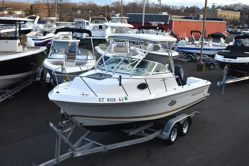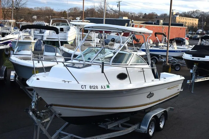 You are viewing for sale by Diamond Marine of Connecticut, a local trade-in, 2001 Aquasport 215 Explorer walk-around fishing boat, motor and trailer package. This overnighter is powered by a Mercury 200hp EFI Fuel injected, two-stroke outboard with hydraulic steering and stainless steel prop that will take you to your favorite offshore fishing spots. This complete package includes a tandem axle trailer. This one comes nicely equipped with a hardtop w/ rocket launchers, rear spreader lights, front light bar, 1/4 Swim platform w/ 3 step boarding ladder, Under gunnel horizontal rod storage, Twin helm cushioned seats, Motor well removable wave gate, Self bailing cockpit, Dual Battery w/ switch, Port and starboard floor fishboxes, Livewell, Tilt steering wheel, Cushioned V-Berth seating w/ removable table, filler cushion and under storage. Boat was taken in on trade and gone through thoroughly by our service staff. This one is ready for its next captain. Please email or calll with any questions and ask for Mark or Karl. Thank You,