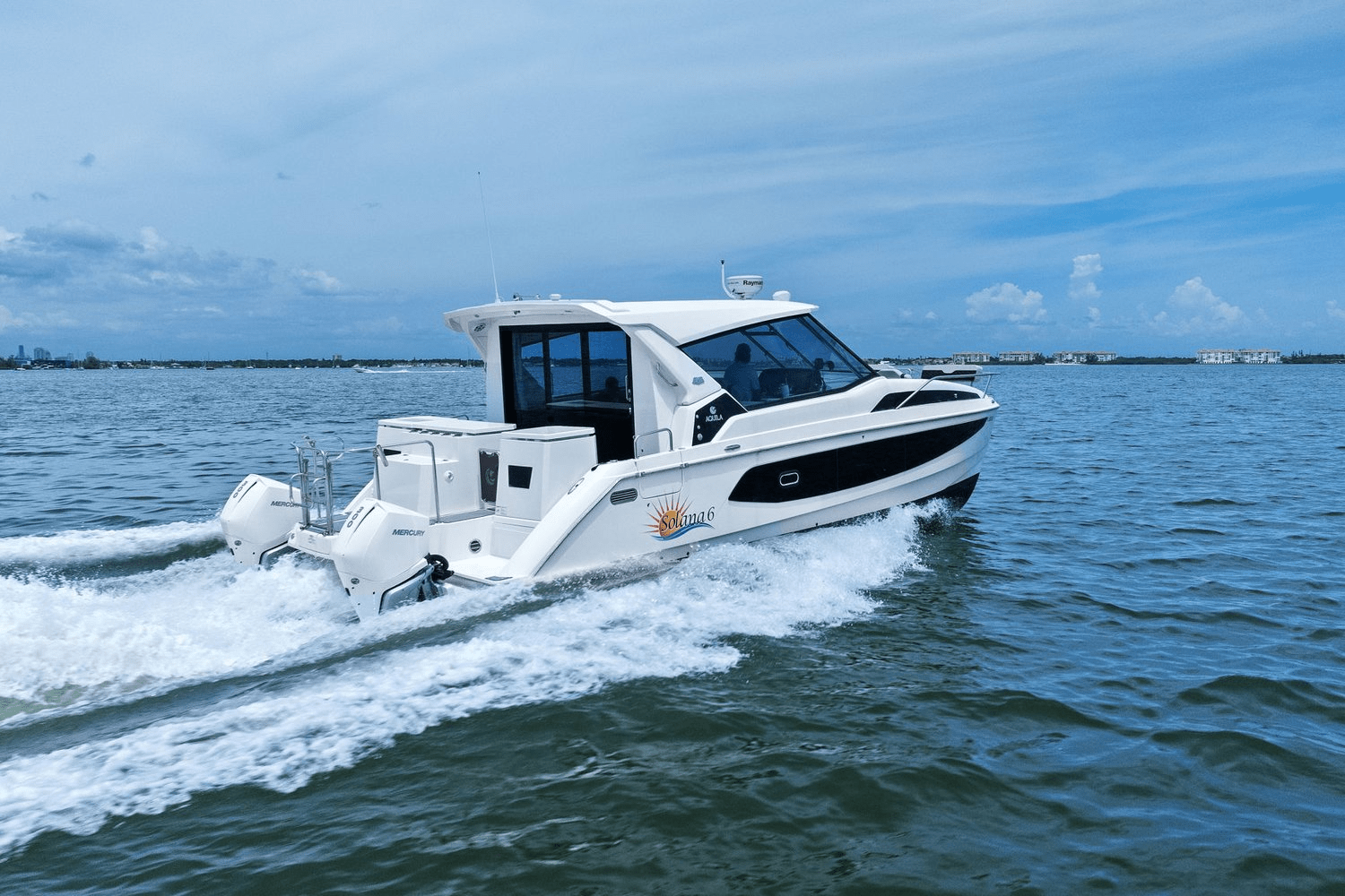 This Aquila 36 stands out with its sought-after Cruiser Package, featuring a fully enclosed air-conditioned salon that allows you to cruise comfortably in any weather. She's powered by reliable twin Mercury V8 300hp Verado outboardswith only 325 hours, and enhanced with the Aquila Hydro Glide Foil System, delivering improved fuel efficiency and a remarkably smooth ride.