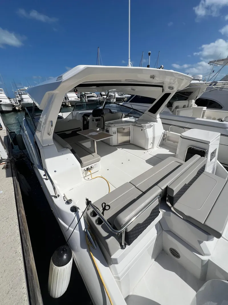 The Aquila 36 Sport can accommodate most conditions. The controls are strategically positioned to give the operator complete command of the vessel and the White Mercury 400 Verado L6s Joystick Piloting option makes docking and close-in maneuvering intuitively simple. Easily operated and safely able to manage open seas, the Aquila 36 Sport is in a class of its own.