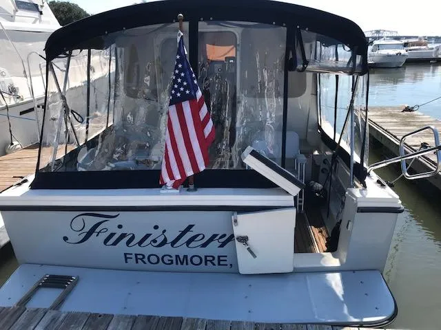 Large centerline berth forward followed by a settee aft to port, the large head aft to starboard with large stall shower, vanity w/ sink and hot and cold pressure water and Vacuflush toilet. (The head and shower on Finnestera comparable to those found on much larger vessels) three steps up to the pilothouse has the helm to starboard followed by the galley with Dometic AC/DC refrigerator, Two burner Origo electric stove, and Magic Chef Microwave. There is a stainless steel sink with hot and cold pressure water. Opposite the galley is a large settee with dining table. All windows have interior canvas privacy curtain (2021). White Vinyl headliner throughout. Through cabin door and down a step is the cockpit which has a canvas Bimini top with full Eisenglas enclosure (new 2021). There is a cockpit shower aft next to the transom door which leads to the swim platform and boarding ladder. Cockpit and cabin soles are covered in Faux teak. !6000 btu reverse cycle AC unit in forward cabin built in under settee. keeps things cool below. Sliding Pilothouse windows and two overhead hatches provide additional ventilation when underway.