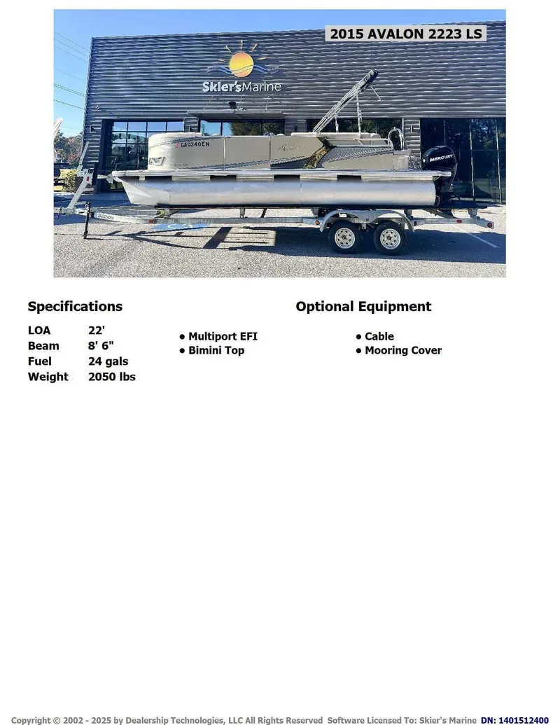 2015 AVALON 2223 LS, The 2015 Avalon 2223 LS is a 22-foot pontoon boat known for providing affordable luxury and a rigid, durable structure. It features a practical, compact 8-foot wide design with Deco 4 external multi-panel walls and comfortable Matrix 50 soft-touch vinyl seating on lifetime aluminum frames. The helmstand includes a Millennium stereo with speakers, tach, volt, and fuel gauges, a windshield, and a black soft-grip steering wheel. This model is trailerable and offers various interior layouts, including fishing