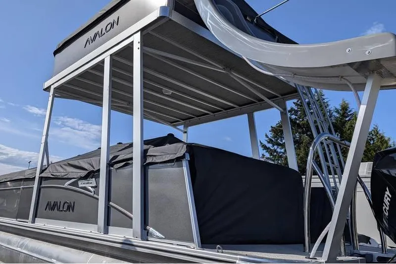 The Avalon Catalina Cruise Funship takes luxury pontooning to new heights-literally. Featuring a double-decker design with a water slide, this premium tri-toon is built for fun, comfort, and performance. Finished in sleek Charcoal Metallic walls with matching Carina Koolfab Charcoal upholstery, it combines bold styling with Avalon's signature craftsmanship.