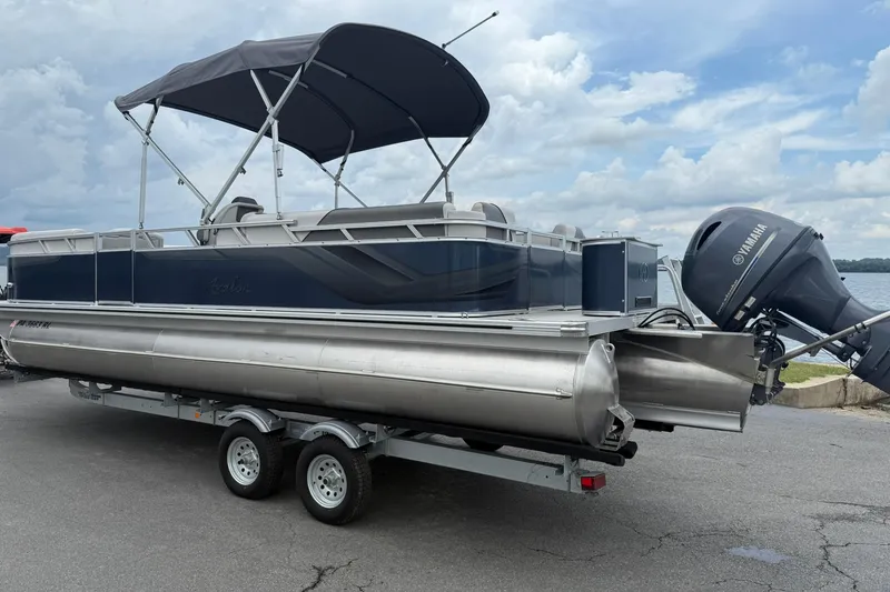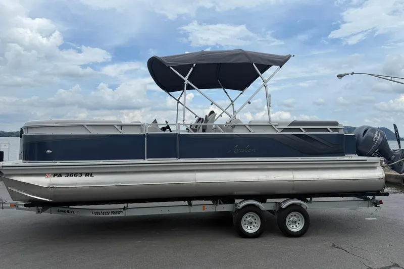 Used 2024 Avalon 25' Venture 85 Quad Lounge Tritoon. This boat is powered by a Yamaha 115 with 209 hours on it. It has seat covers, 4 pull up cleats, fender holders, depth finder, turbo swing ski bar, fusion stereo, docking lights, and includes all the gear. It also comes with a brand new load rite dual axle trailer. Give us a call to discuss this boat.