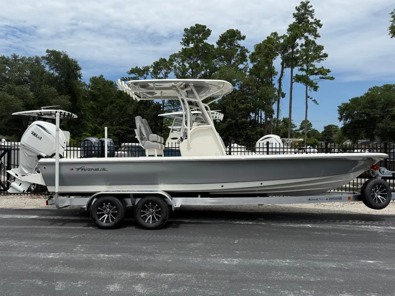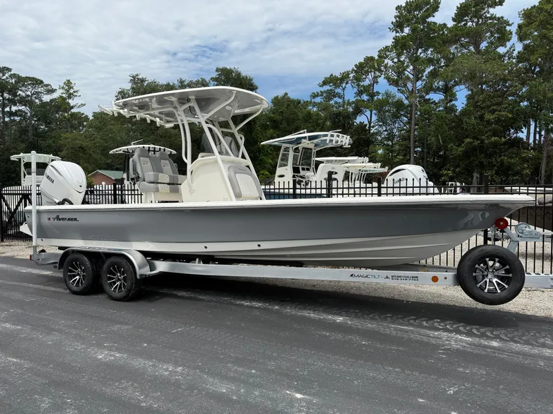 The Avenger AV-26 has an overall length of 26 feet 2 inches and a beam of 8 1/2 feet built with the serious fisherman in mind. This stable fishing platform is complimented with standard equipment like two live release and one bait well, dual lockable rod storage boxes, and an anchor locker built to accommodate both bow and stern anchors. The Avenger AV-26 is rated for a single engine of up to 400 HP and features an 79 gallon capacity fuel load, making your favorite fishing spot easily and quickly accessible.