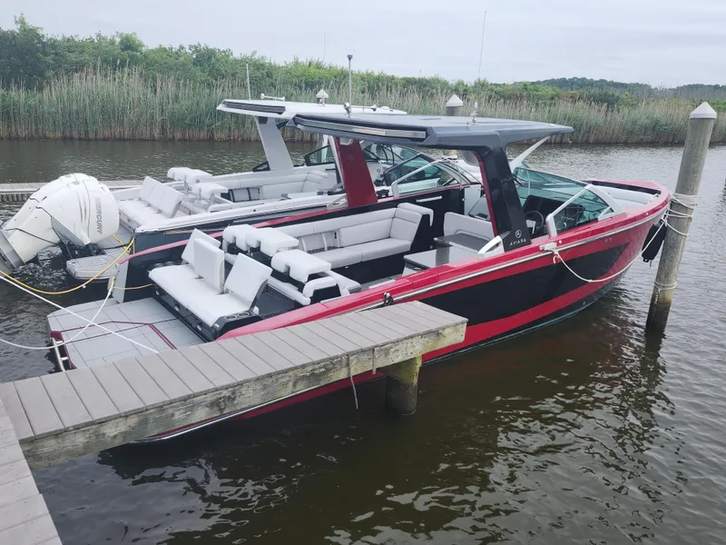 Experience the perfect blend of modern styling, luxury amenities, and performance with this 2020 Aviara AV32 I/O. Designed for day boating and entertaining, the AV32 stands out with a wide beam, deep freeboard, and open bow-to-stern social spaces. Powered by twin Ilmor MV8 380HP engines with joystick docking, this boat offers confident handling, quiet performance, and a truly premium ride.