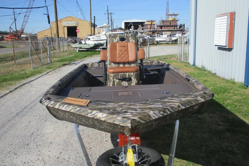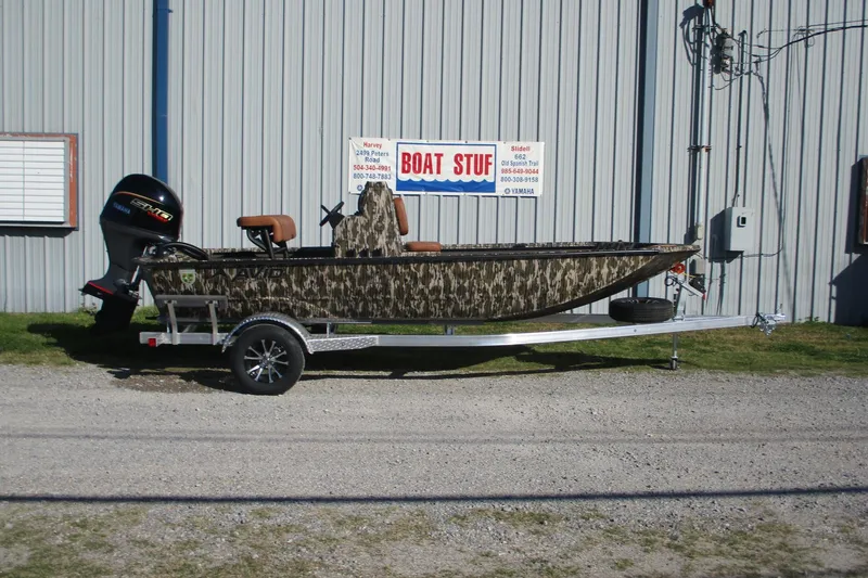 This 18 Rogue is powered by a Yamaha VF90XB and equipped with a Garmin ECHOMAP 74sv with GT23 transducer. It features three seat bases across the front deck and is finished in the rugged Gamekeeper Camo Package with Forge Brown interior. The boat sits on a Rogue aluminum trailer complete with a spare tire and mount.