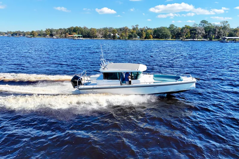 The cabin layout is thoughtfully designed to maximize space and usability, featuring a cozy seating area with ample headroom, perfect for relaxing or entertaining guests. Large windows provide panoramic views and fill the interior with natural light, creating an inviting atmosphere. The helm is equipped with advanced navigation technology, ensuring a smooth and intuitive driving experience.
