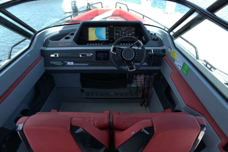 Boarding at the stern, you will note the Mercury Racing edition V8 250HP engines with a black powdercoated towing point above them. Synthetic grey decks run the length of the vessel with heavy duty rubber rub rails surrounding the hull. The aft cabin is accompanied by a diamond stitched red sunpad above it, with diamond stitched seats to port and starboard with storage beneath. Four bucket seats sit midship and directly behind two additional inset helm seats. Access to the cabin is below the center two guest seats with a lifting gas shock assisted door. The arch top covers all the guests and leaves room for walkthroughs to the bow seating area. The entire bow can serve as a sunpad, or can be modified for a cocktail table insert to starboard. Directly in front of the helm is a recessed head and storage area with a sink and vanity.