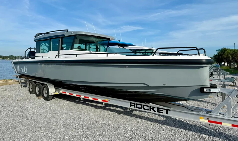 This model combines the functionality, ease of movement, social outdoor and indoor spaces and versatility of outboard walkaround center-consoles with a spacious, fully enclosed weather proofed cabin, that with distinctive looks challenges traditional perceptions of cabin boats.