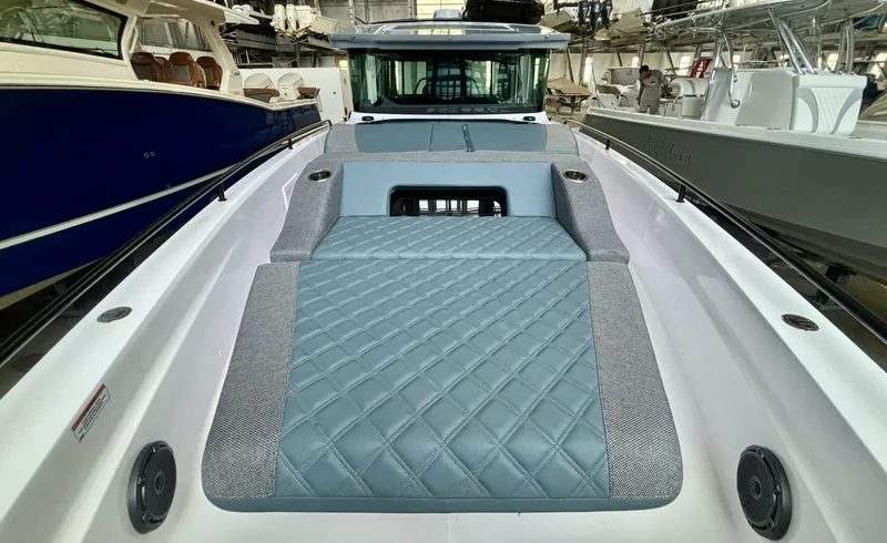 Continuing forward through the walkaround side decks, you arrive at the inviting foredeck lounge. Here, a comfortable sunbed and seating area create the perfect space to relax while at anchor or enjoy the view while cruising. Integrated grab rails, non-skid decking, and high bulwarks provide security when moving around the vessel. A spacious anchor locker with dedicated rope storage sits forward, making anchoring operations simple and efficient. From this vantage point, the Axopar’s signature sharp-entry bow and twin-stepped hull design hint at the exceptional offshore performance and smooth ride that have made the Axopar 37 XC Cross Cabin one of the most sought-after adventure boats in its class.
