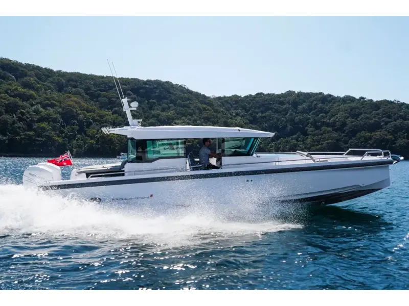 This model combines the functionality, ease of movement, social outdoor and indoor spaces and versatility of outboard walkaround centre-consoles with a spacious, fully enclosed weather proofed cabin, that with distinctive looks challenges traditional perceptions of cabin boats.