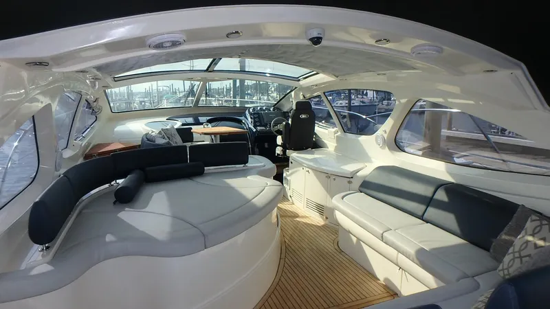 Cockpit Bridge entertaining space is HUGE with three built in couch areas, teak flooring throughout and a dinette with wrap around seating, a sun bed and a retractable glass moonroof! Comfortable Fun in the Sun takes on a new meaning with this vessel.