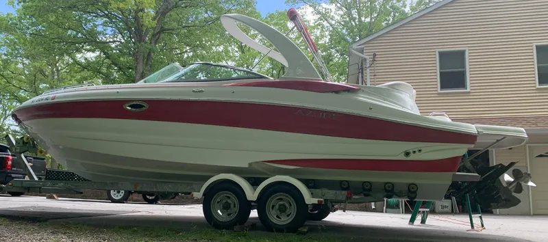 here we have a fresh water boat used on a lake with a fresh water cooled mercury 496 mag 8.1 liter 375hp engine with 200 hours. bravo 3 outdrive gets her up and quickly and is great for the dockside maneuvering. the boat is on a trailer as well. enclosed head as well. lots of seating everywhere and she is well appointed too. large swim platform and boarding ladders in the bow and stern make this a great usable boat for lots of fun! there is a depth sounder and a color gps, rear lounger that flip flops fwd and aft. it has a rockford fosgate stereo system on board to maximise the fun. great storage with compartments all over the place. built in insulated cooler too. the fwd chaise loung style seating in the bow looks extra comfy. snap in carpets on deck for a good feeling on the feet on those hot summer days. there are cockpit covers as well. there is no bottom paint on this boat. it is evident by viewing her that azure did a great job designing and building this boat. she is a one owner boat as well.