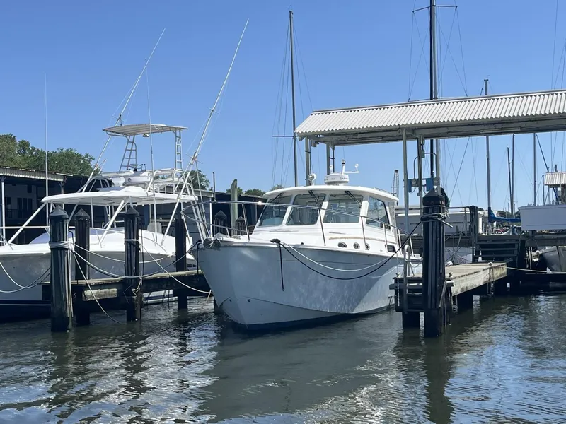 The Back Cove 34 (called the Back Cove 33 until 2012) is a handsome Down East cruiser whose single-diesel efficiency, versatile layout, and leading-edge construction made her one of the more appealing boats in her class. Like all Back Cove models, the 34 rides on a vacuum-bagged, PVC-cored hull with a reverse transom and a shallow prop pocket. The layout is as simple as it is elegant; a large bench seat in the cockpit and raised dinette on the semi-enclosed bridge deck provide seating for family and friends. Note that the in-line galley is positioned behind the helm, opposite the dinette, rather than in the cabin. The entire bridge deck lifts on hydraulic rams for engine access. Below deck is a large and comfortable V-berth forward, convertible L-settee with inlaid teak table to port, and a large head with separate stall shower to starboard. (Note that a queen berth forward is standard in the 34 model. The cabin is finished with varnished cherry joinery, premium hardware, and an elegant teak and holly sole. Wide side decks are a plus, and a standard helm chair and bow/stern thrusters are standard. The 2013 Back Cove 34 No Pressure is conveniently located in the Orleans Marina at 221 Lake Marina Ave, New Orleans, LA 70124, which is only a short drive from the New Orleans International Airport (MSY).