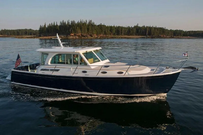 The flagship of the Back Cove fleet, the Back Cove 41 is fitted with an efficient single diesel engine and straight shaft. The addition of thrusters, a generator set, and reverse cycle heat and air conditioning systems make her maneuverable, efficient, and comfortable. Her interior is balanced between two luxurious staterooms, each with a private head. Nautically sensible details and Maine craftsmanship can be found throughout her American cherry interior.