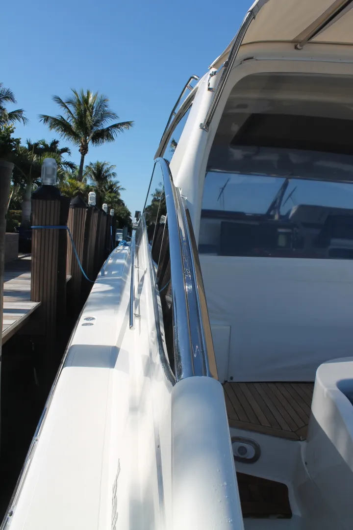 The fiberglass hard top with radar arch is very versatile. When the electric powered sun roof is closed, the immense cockpit lounging area can be closed off with Isinglass curtains and A/C. The cockpit has a helm station forward that was given new dashboard graphics in 2013. There is bolstered seating for 6, while to starboard are 2 refrigerated drink lockers, a U-Line icemaker, and wet bar with built-in flat screen TV.