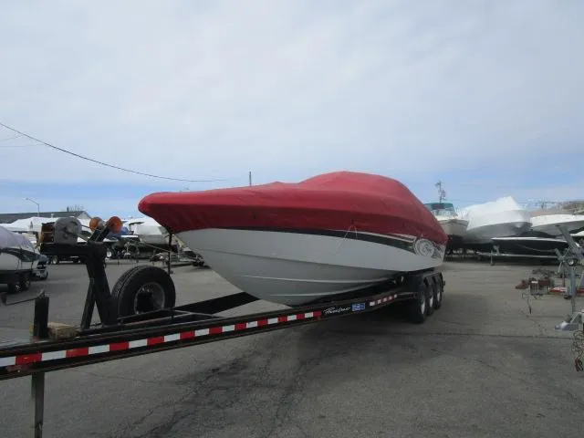 Powered with 502 MAG/MPI with 798 hours and Bravo 3 drive. Integrity tri-axle trailer, over the windshield cockpit cover, bow cover and docking lights. Thru hull exhaust, drive shower, stainless cleats/cup holders, new Sea Dek in cockpit & platform, rear sun pad and fresh water system with cockpit sink. Fume detector, dual batteries with switch, compass, cockpit fridge, in dash depth finder, halon system and helm/passenger drop out bolster seats. Fusion stereo with helm remote, in floor ski locker, power engine hatch, cuddy with porta potty with filler cushions. 12 volt plug and bow filler cushions.