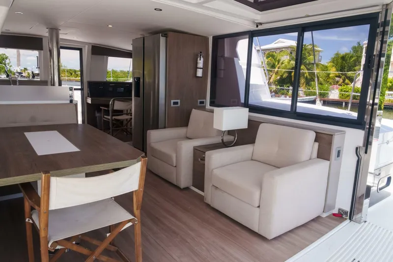 Modern French design featuring the iconic "garage door" system connecting the salon to the aft cockpit, as well as the convenient door opening the galley to the forward cockpit, a feature rarely found on catamaran in her class. Spacious layout with symmetrical configuration featuring 4 cabins, each with private heads and separate shower stalls. Self-tacking jib, panoramic windows, flybridge seating.