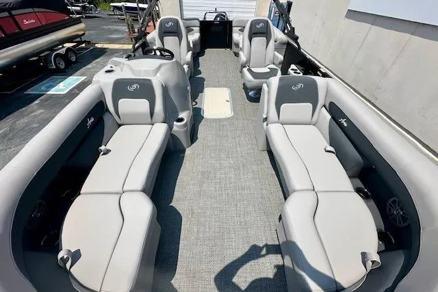 On Sale Now! New 2025 Barletta A22QC powered by Mercury 150L. Includes Blackout Package, Tempest Gray furniture, Amore Gray flooring, Triple Toon Package with Midship Storage, Simrad G07SXE, Bear trailer and more.