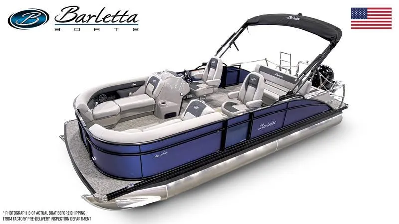 Our best selling tri-toon with 150hp Yamaha outboard. Pacific Matte Blue railskins with Barletta's blackout package. Comes with Barletta's exclusive ultra-lounge seating along with JBL Bluetooth stereo, Lowrance Hoo5 depth/fish finder, power bimini and much more!