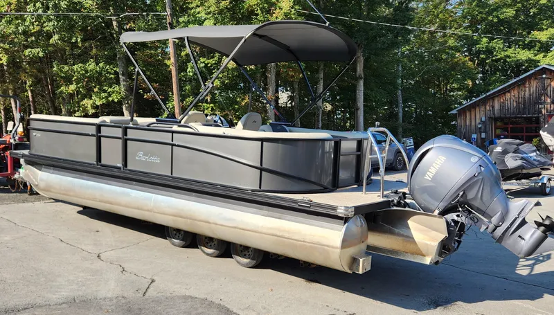 Classic Gray Moonstone Aria 24QC with Yamaha 150hp motor. Options include Blackout Package, Triple Toon Package, Stainless Steel Flagpole w/ American Flag, In-Floor Midship Storage, and Removable Table. Includes boat and motor warranties. 158.3 hours