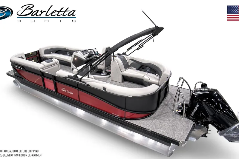 New 2026 Barletta C24Q powered by Mercury 200L. Includes Triple Toon Package with Storage, Onboard Battery Charger, Stainless Flag Pole with USA Flag, Bear Trailer and more.