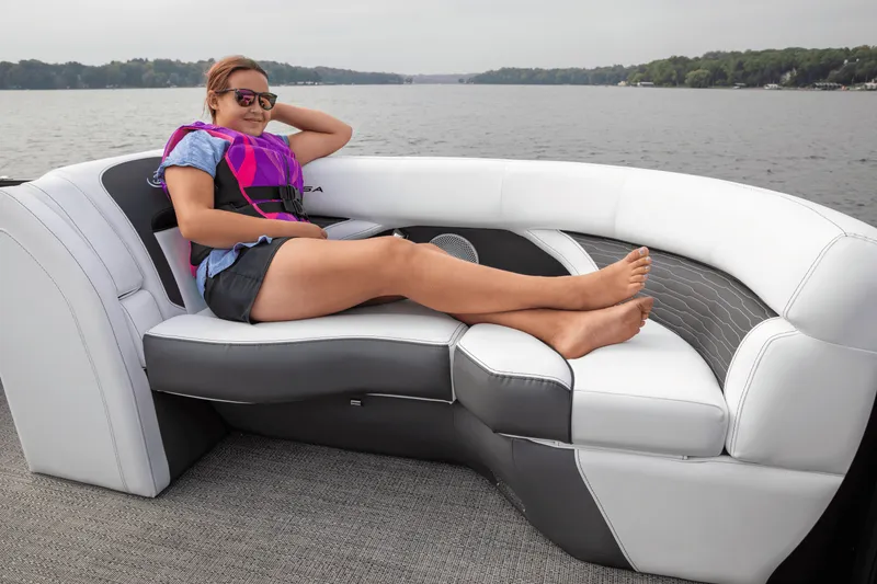 Sleek and Sporty Design: The Corsa 23 UC features a modern, sporty look with clean lines and premium finishes that set it apart from traditional pontoon boats.