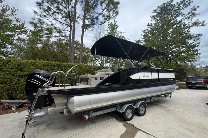 The 2019 Barletta L25UC L-Class is a tritoon with 26" tubes and lifting stakes, making it a fast pontoon. Measuring 27.5 feet in overall length, this used vessel is crafted from durable aluminum, ensuring longevity and stability on the water. Powered by a 400 hp Mercury Verado outboard engine, it cruises between 22-28 mph, and has top speed of approximately 47-52 mph. The L25UCL comfortably accommodates up to 14 passengers, making it the perfect boat for group outings. Its pontoon shape provides buoyancy and stability for security on the water. Modern features and a spacious layout makes this boat ideal for taking in scenic views or a full day of watersports. An EZ Loader tandem-axle trailer is included in the sale of this vessel.
