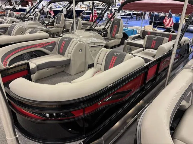 Railskin Color: Black Diamond, Railskin Color Accent: Macau Red, Railskin Packages: Blackout Package Corsa, Furniture: Soft Touch Marquesan Gray with Red Accent, Flooring: Amore Gray, Triple Toon Package w/ Midship Storage - Corsa, Pre-Rig: Mercury Digital DTS Pre-Rig for NON-VERADO with Vessel Link, and Power Assist Steering, Rigging: Rig Engine w/ Stainless Steel Prop, Exterior: Stainless Steel Flag Pole w/American Flag, Exterior: Stainless Steel Safety Stanchions w/ Chains, Interior: Adjustable Pedestal on Captain's Chair (Helm), Interior: Table, Pedestal, and Base with Yeti-Ready Cupholders (Dealer Install for Customer Preference) Entertainment: Anchor Storage at Bow Gate, Entertainment: Stereo Remote at Stern Swim Deck, Helm: Corsa Simrad Engine Integration w/Digital Motor