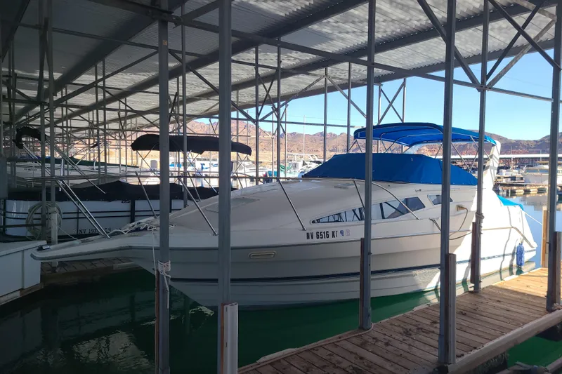 This Fresh water, low hour Bayliner 2855 Ciera Sunbridge is the makeover of the previous 2855 Ciera with updated styling, a revised interior ( bigger galley ), and increased storage space. The hull is basically the same as the earlier 2855 with an extra inch of beam.while she's definitely on the light side compared with similar boats her size, the 2855 rides very well in a chop thanks to her deep-V hull design. The midcabin floorplan is arranged in the traditional manner with double berths fore and aft, compact galley, and a booth-style dinette that converts to sleep two. Privacy curtains seperate both sleeping areas, and headroom is adequite throughout most of the cabin. Topside, a big U-shaped lounge (with remote table) is opposite the helm. Lacking side decks, a windshield walk -through provides access to the foredeck. Additional features include a slide- out jump seat behind the companion lounge, transom door, sport arch, and molded pulpit. This boat also comes with a Carry Air ac unit which fits in the deck hatch.