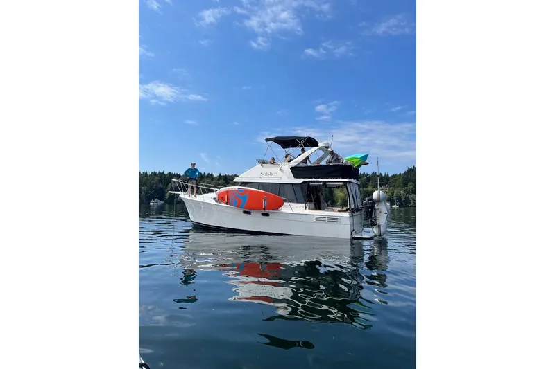 Solstice is an excellent example of Bayliner's all time best selling motoryacht. This versatile vessel provides everything you need for year round cruising. Solstice features two double staterooms, a full galley, complete marine head, and a spacious salon for comfort. She offers everything you need including full enclosure and powered by economical and reliable twin Hino 150hp diesel engines. These combinations are what makes Solstice a favored Pacific Northwest cruising choice. The highly desired full width transom and transom door provides for for easy boarding.