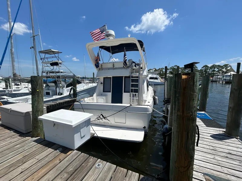 VELARIS is a Bayliner 3788 Command Bridge M/Y with Twin Mercruiser 7.4L Engines, upper and lower helm stations, and Flybridge Bimini. Inside you will find two nice staterooms, a head with shower and a large open salon and galley area. Along with her lower helm station, she has a nice size command bridge with seating for five, a transom door for easy access on and off the boat. This boat is a great boat that will get you out on the water anytime of year!