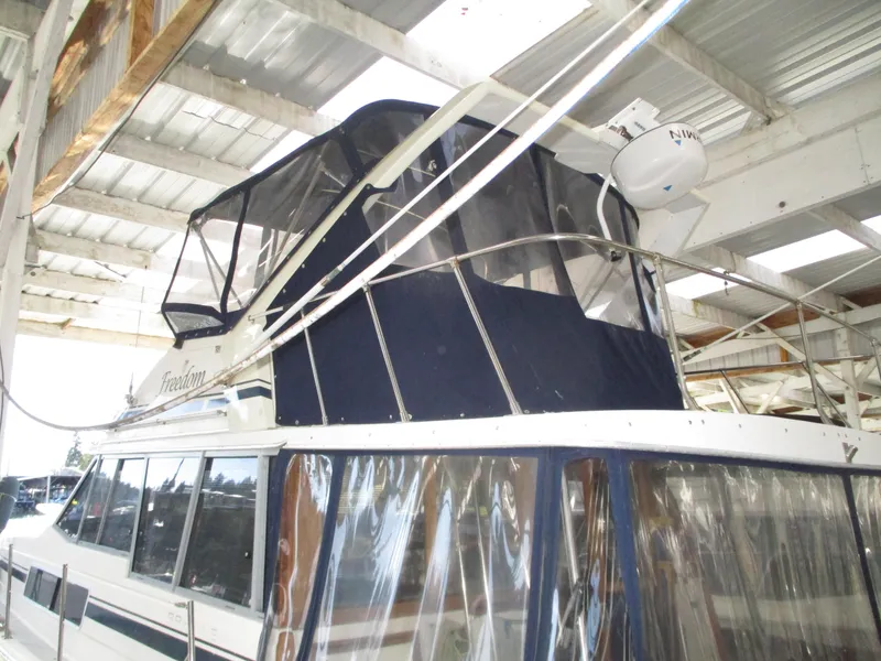 Introducing the Bayliner 3888, a stunning 38-foot flybridge vessel from 1989, renowned for its robust fiberglass construction and elegant design. This used beauty is powered by twin Hino EH700 diesel engines, each delivering 175 horsepower, ensuring a reliable and exhilarating cruising experience. With a cruising speed of 16 knots and a maximum hull speed of 22 knots, the Bayliner 3888 promises thrilling adventures on the water. Equipped with an electric windlass, this boat combines convenience with functionality, making anchoring a breeze. The thoughtful layout includes a large salon with L-shaped seating and table, large windows for viewing. The helm is to starboard. The galley is down. There is a guest stateroom is to the port with the primary stateroom forward with a centerline queen bed. There are two heads one with a tub/shower providing ample facilities for guests. The fully enclosed flybridge offers an elevated vantage point, perfect for enjoying scenic views while navigating. Whether you're planning a weekend getaway or a longer voyage, the Bayliner 3888, affectionately named "Freedom," is ready to deliver comfort and performance, making it an ideal choice for any boating enthusiast.