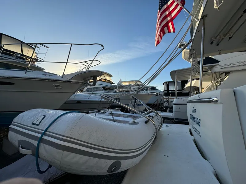 She has a 2 stateroom / 2 head layout that sleeps 6 with the convertible salon sofa, master stateroom with a centerline queen, and guest stateroom double berth. Both staterooms have private heads with showers, and the master stateroom head features a large shower tub. The U-shaped galley contains a side-by-side fridge and factory installed Corian style hard surface counter tops.