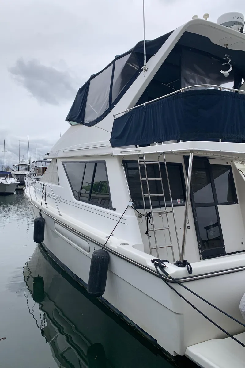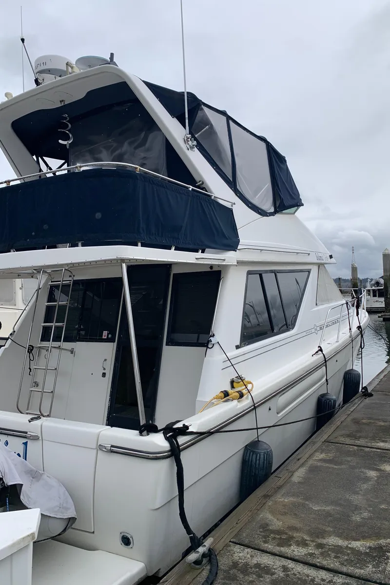 Reduced 15k!! NOW $114,500!! BAYLINER 3988 WITH TWIN 330 HP CUMMINS AND BOW THRUSTER!! This is one of the roomiest well layout vessels on the water for 39'. This is a 2 stateroom boat with 2 heads with a shower/tub in the master stateroom head. The main level has a very bright interior that includes large salon, dinette with new seating material, galley and lower helm. Cockpit has the nice hardtop with full enclosure. The flybridge has full enclosure. The swim step has a tender with a launch davit system.