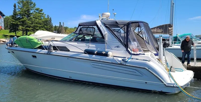 Comes equipped with: Twin Cummins diesel 5.9 330HP engines with 915 hours, diesel 8KW generator with 90 hours, 2000 watt inverter, autopilot, windlass anchor, AC/Heat, Raymarine radar, full enclosures w/Screens, remote spotlight, triple amp battery charger, dual batteries w/Switch, VHF radio, AM/FM/CD stereo w/Cockpit & Speakers, cockpit wet bar w/Refrigerator, removable and adjustable cockpit table, electric range, large cabin refrigerator w/Freezer, water heater, swimplatform w/Fold down ladders, (2) private double birth staterooms, porcelain head, separate shower, cabin TV, features seven feet of headroom in the salon, and more! The Bayliner 4085 Avanti has a spacious layout to fit all your friends and family comfortably. Currently located in Washburn, WI. Give us a call and schedule an appointment to see this beauty in person!