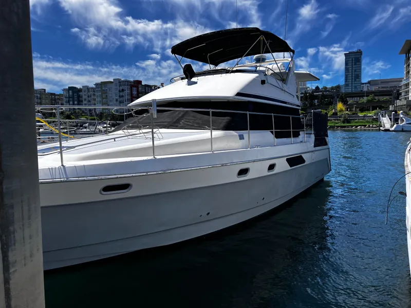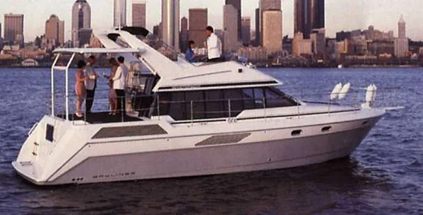 The Bayliner 4387 Aft-Cabin Motoryacht is perfect for long-range cruising in comfort and style. The interior features two private staterooms, two complete heads, a spacious salon, a full electric galley, an aft deck & flybridge. Engines recently equipped with fuel injection. The galley has a full size fridge and twin, porcelain sinks. Large flybridge and cockpit with full covers and isinglass.