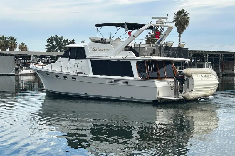 "Enchantment" is a nicely upgraded vessel that has three staterooms, two heads, open salon with galley on same level. There are dual helm statations in the pilothouse and large flybridge. The interior has newer hardwood teak and holly sole and LED lighting throughout the boat, updated upholstery in salon, and newer counter tops and sink in galley. The staterooms are tastefully decorated and are in good shape throughout. The boat offers air conditioning and heat, updated stereo with speakers throughout the boat, three new TV's with the one in salon on a TV lift system, a wet bar in the salon, and dinghy with a SeaWise davit system for easy deployment. The boat is powered by twin Hino diesel engines with a generator and inverter.